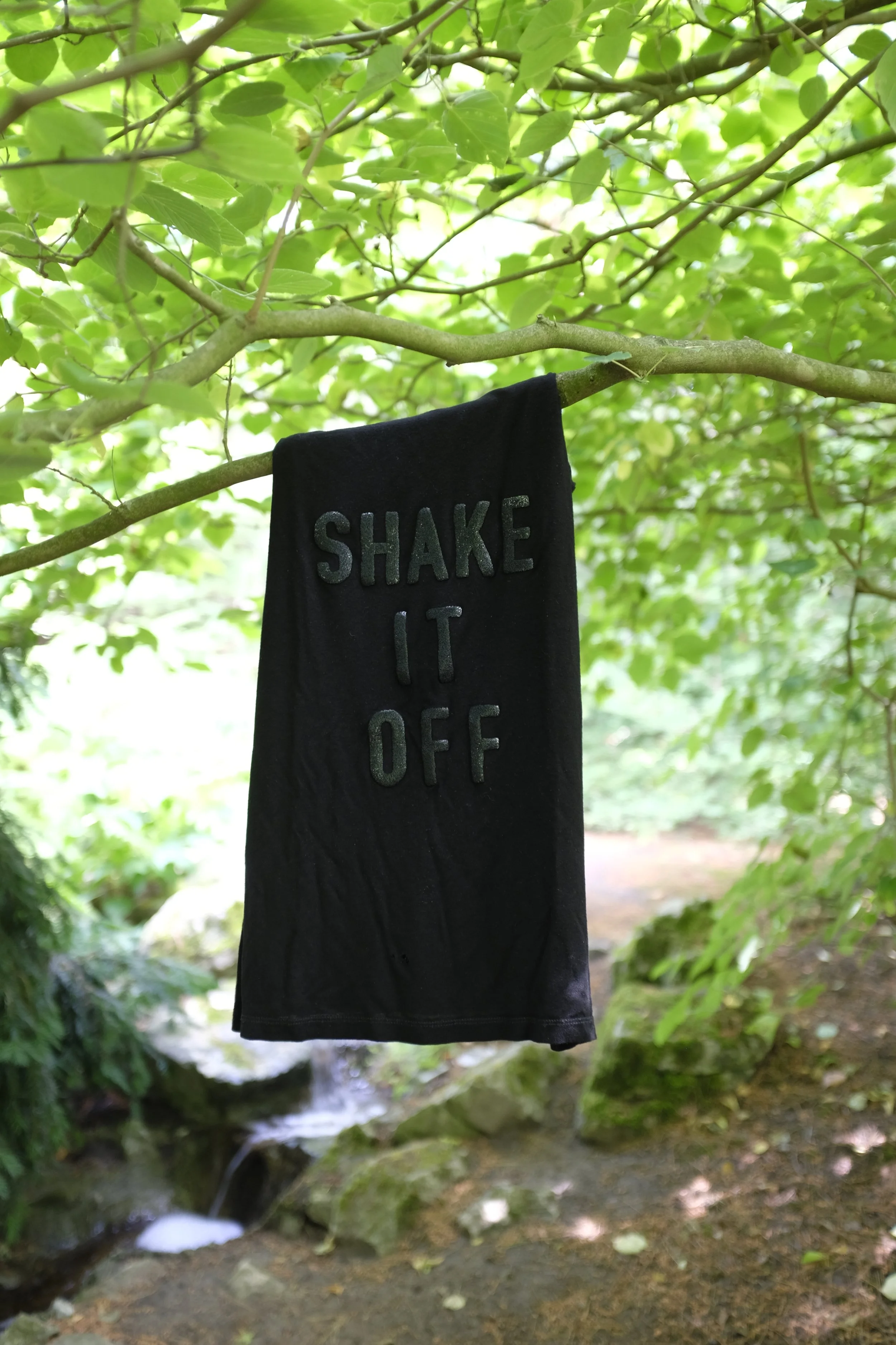Zwart stuk doek met de tekst 'SHAKE IT OFF' hangt aan een tak in een bos, met een achtergrond van groene bladeren en een klein stromend beekje.